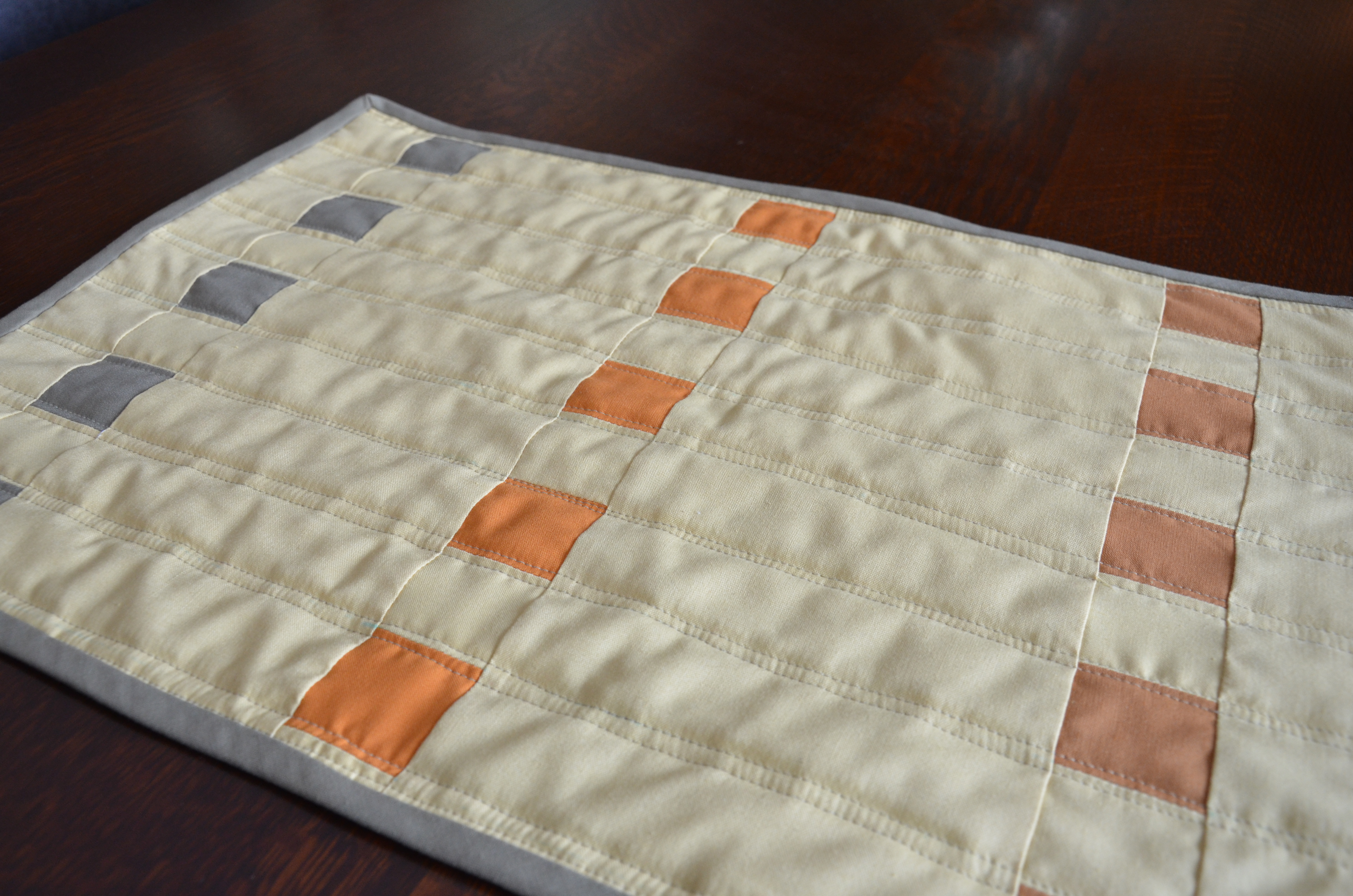 Figured out placement #5. After have 4 place mats finished, keeping my eyes open for appropriate ideas for #5 and #6, this came to me. It’s a variation of one of the earlier ones with a Cherry HouseQuilts twist. I used smaller colorway blocks, finished at 1″, to match the earlier place mat, but other wise the proportions are the same. I love it! Now I need a #6. Maybe one with more of the colors combined? I love Kona cotton solids!