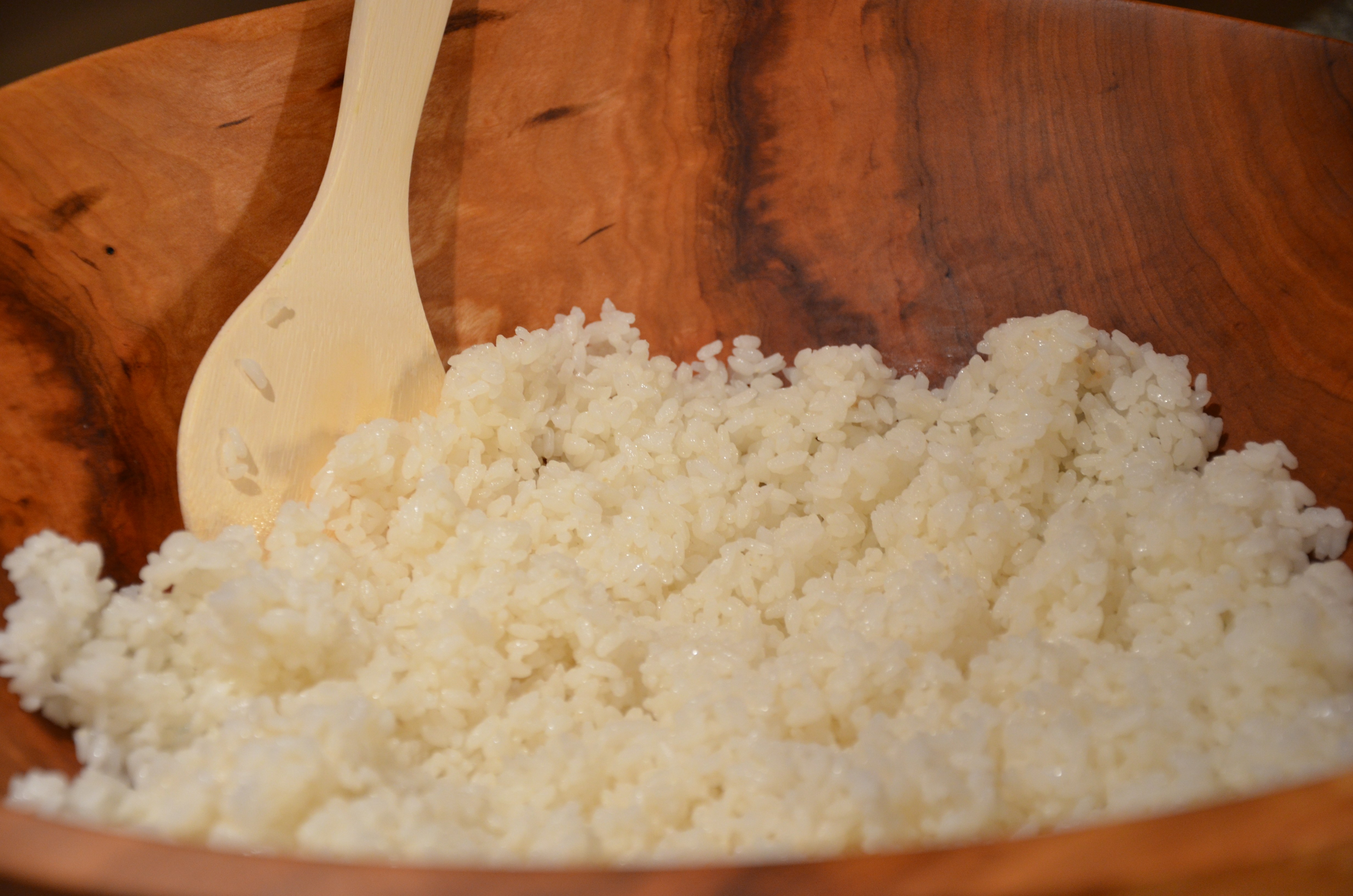 First the steamed rice has to be mixed, in a wooden bowl, with rice wine vinegar, cut in and cooled appropriately. I just hope we haven't ruined our favorite wooden salad bowl, by putting hot rice into it... (We didn't!)