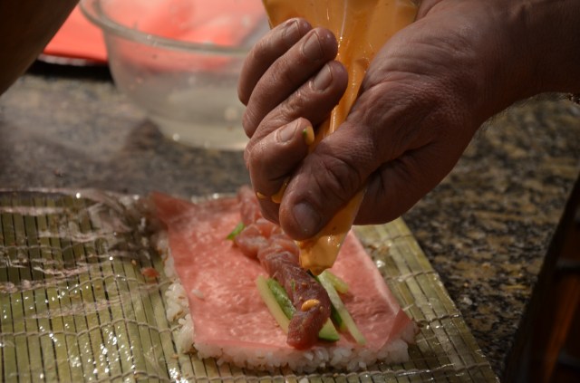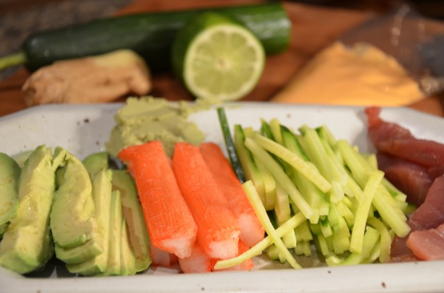 Ingredients prepared. Perfect avocado, real crab, cucumber matchsticks and fresh yellow fin tuna. Let us not forget the wasabi or the sriracha /mayo sauce. Sushi needs to be zippy, in our opinion.
