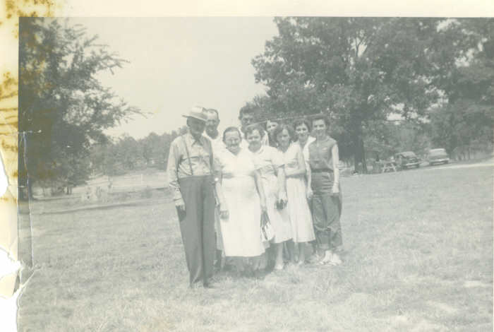 August 1956 Family reunion, at “Mama’s”, I was told.   GGrandpa Roy Bryant and GGrandma Bertha with their children.  In the back, Hobart, Rayford, Reatha, and Geneva.  In the front, Grandma Floye, Freda, and Jeuletta.