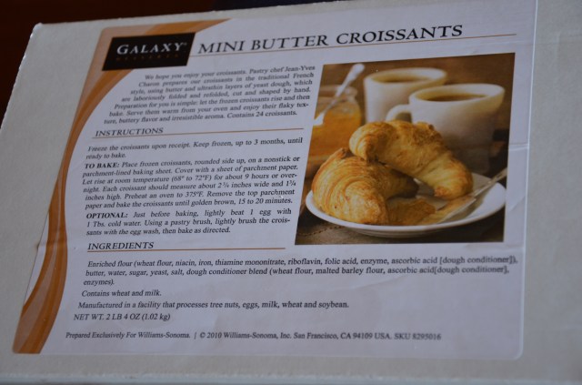 My father-in-law has incredible taste. He sent me a box of these mini croissants, from Williams-Sonoma for my birthday. He knows good stuff, when he tastes it, I have to tell you. These were one of Oprah’s Christmas picks, a few years ago, for very good reason. Our house smelled like a Parisian bakery all morning! Pop however many you want to serve, out of the freezer, into a pan, the night before. They thaw and rise, like magic, while you get your beauty sleep. A quick bake in the oven and you have the lightest, butteriest croissant this side of Paris. In Paris, they throw them out after two hours. These hold up a bit longer. Well, until the last is eaten as an afternoon snack, anyway…. Delish!