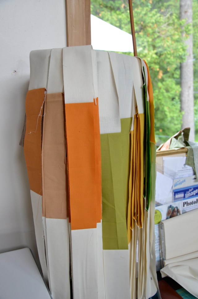 Did you realize that lampshades make perfect holders for fabric strips? Especially when you can spin them? And especially when it’s daylight and you don’t need the lamps for light??? At least this unusually cold, rainy summer is good for something…