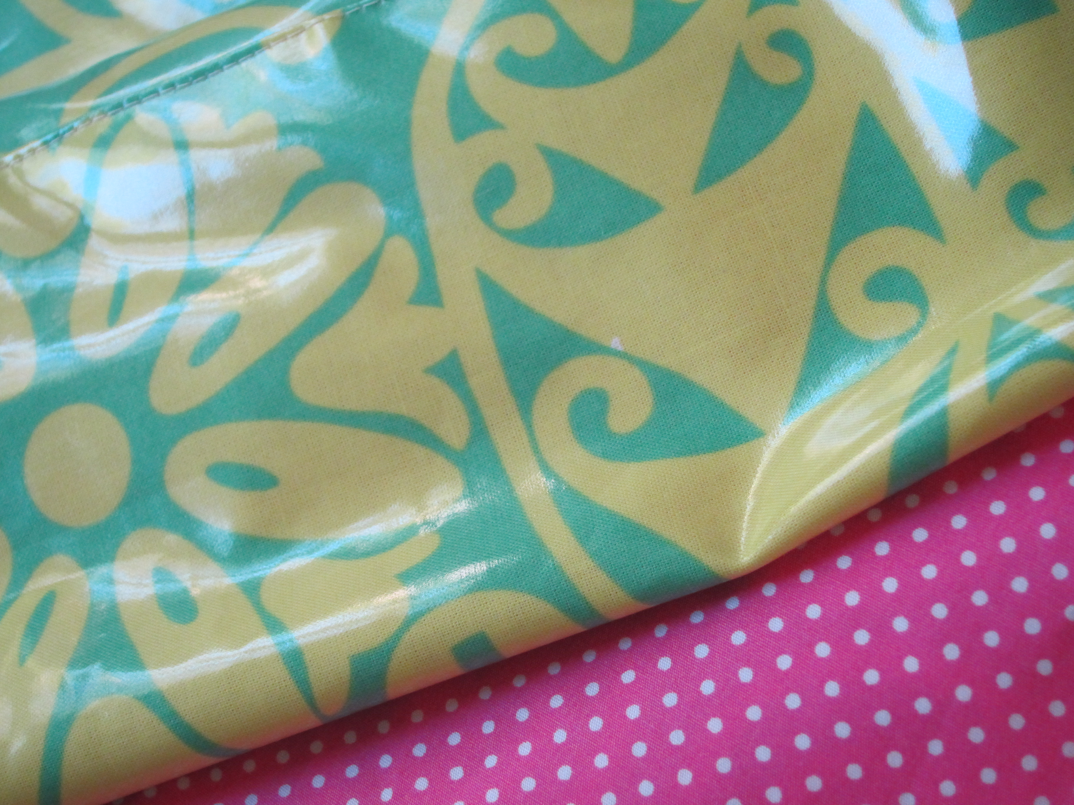 She chose Amy Butler‘s Temple Doors, in Grass. It is very much a bold lime color to be lined with Robert Kaufman‘s Primrose dots. Think hot pink!