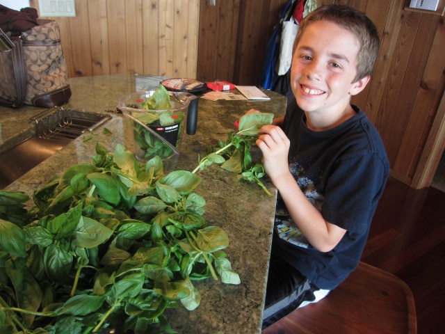 Start with cleaning and cutting 4 packed cups of basil.  A handy, dandy cute as can be grandson works great for this task.  If you don’t have a cute grandson any small child will do.  They generally work for free, that’s a big bonus in my book….