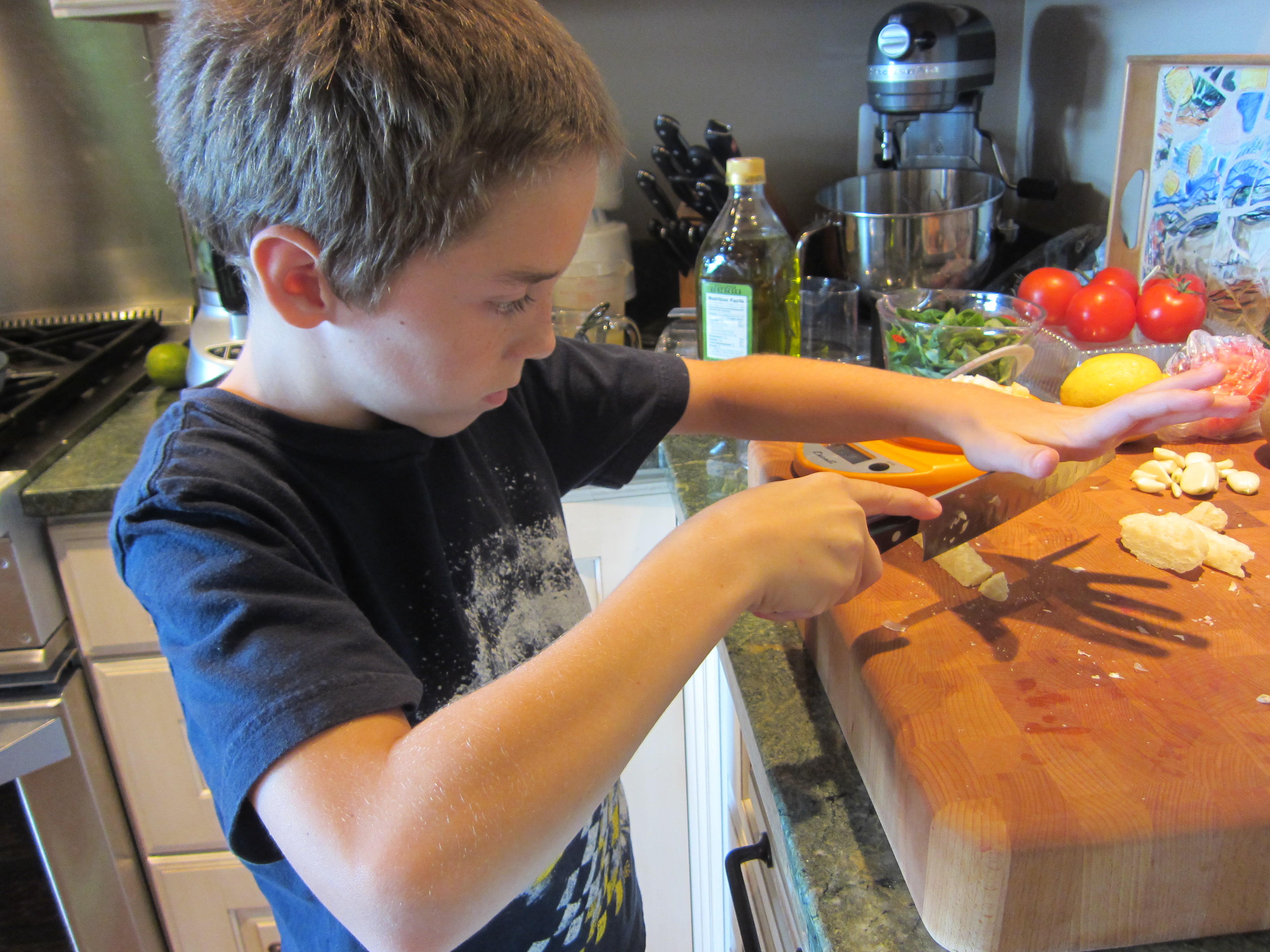 Grate or chop your parmigiano-reggiano cheese.  Spencer chose to chop it since you can use the knife and it’s going into the food processor anyway…