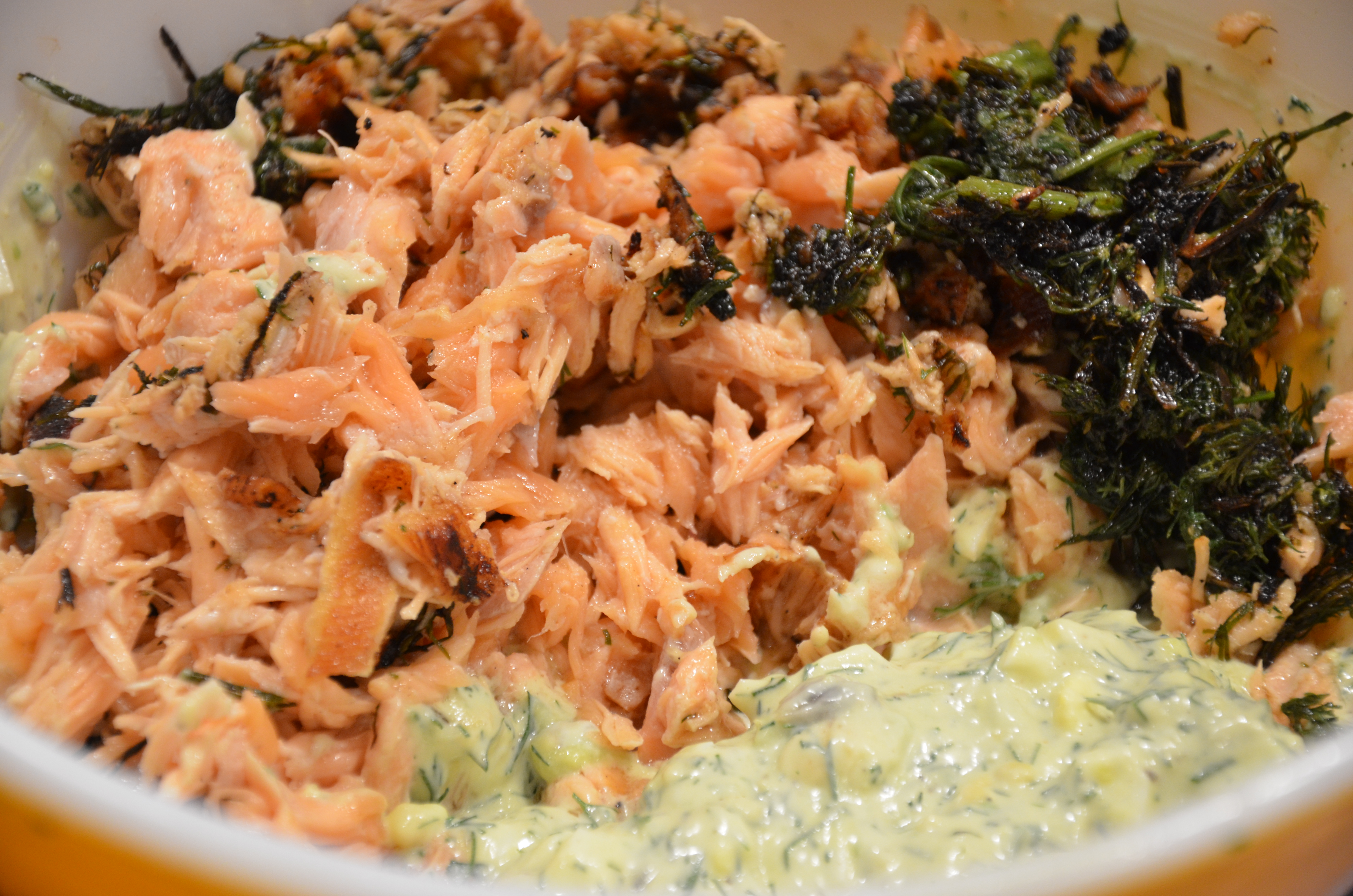 It should be brown and crusty because of the honey mustard, don’t fret, it’s not over cooked. Cook another 4-5 minutes, until done, but not dry. It really depends on the thickness of your salmon. Set aside to cool while you continue on.