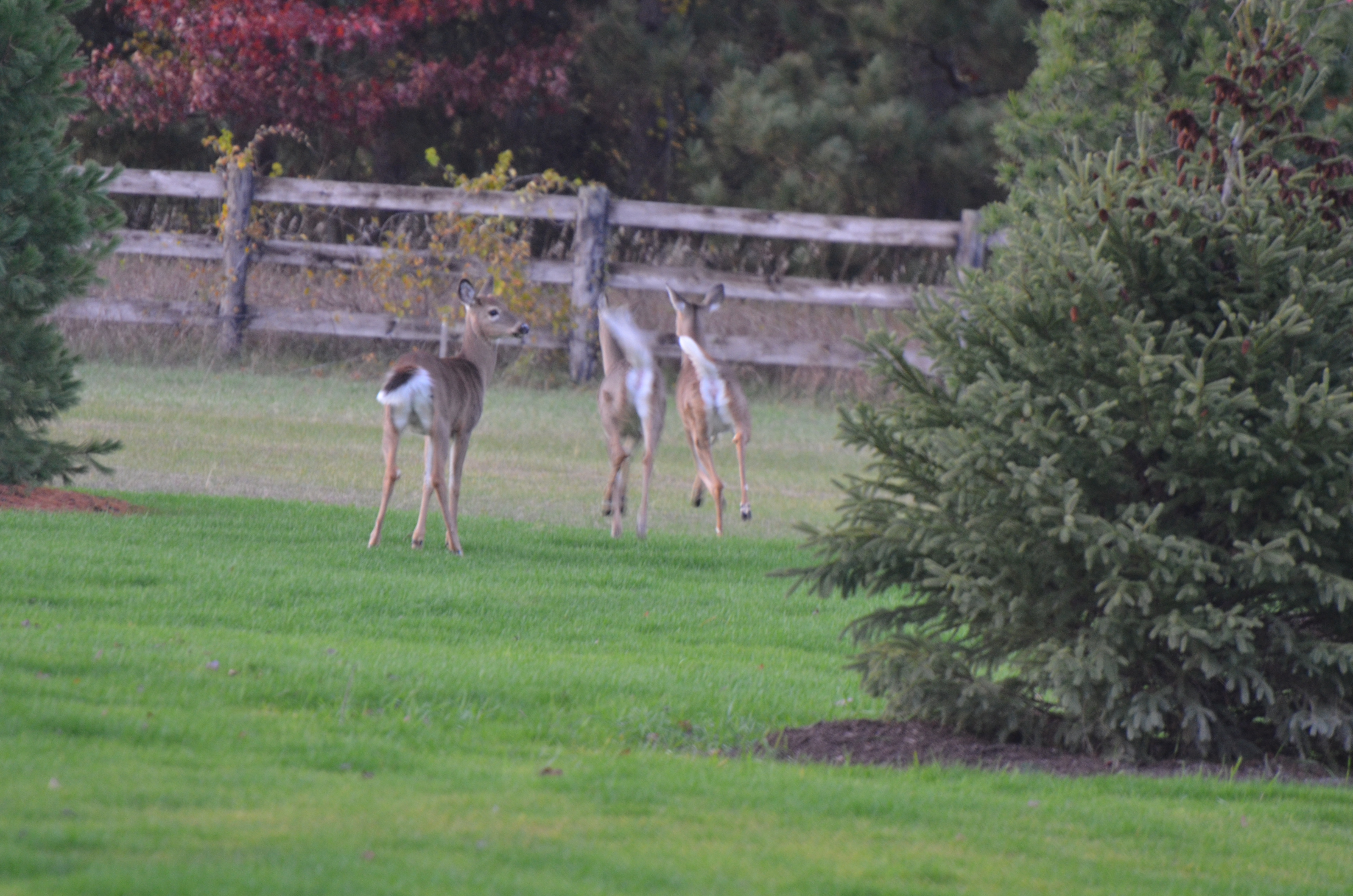 What I didn’t photograph was the older two teaching the younger to cross the fence.  They kept nudging her, in the rear, trying to get him to jump.  They finally went ahead and went over and left her to her own devices.  She was so tempted.  Finally opting to walk to the east, (right) about 20 feet, where the fence is partially down, to just walk across.  I think she’ll last around here.  She seems pretty smart to me!
