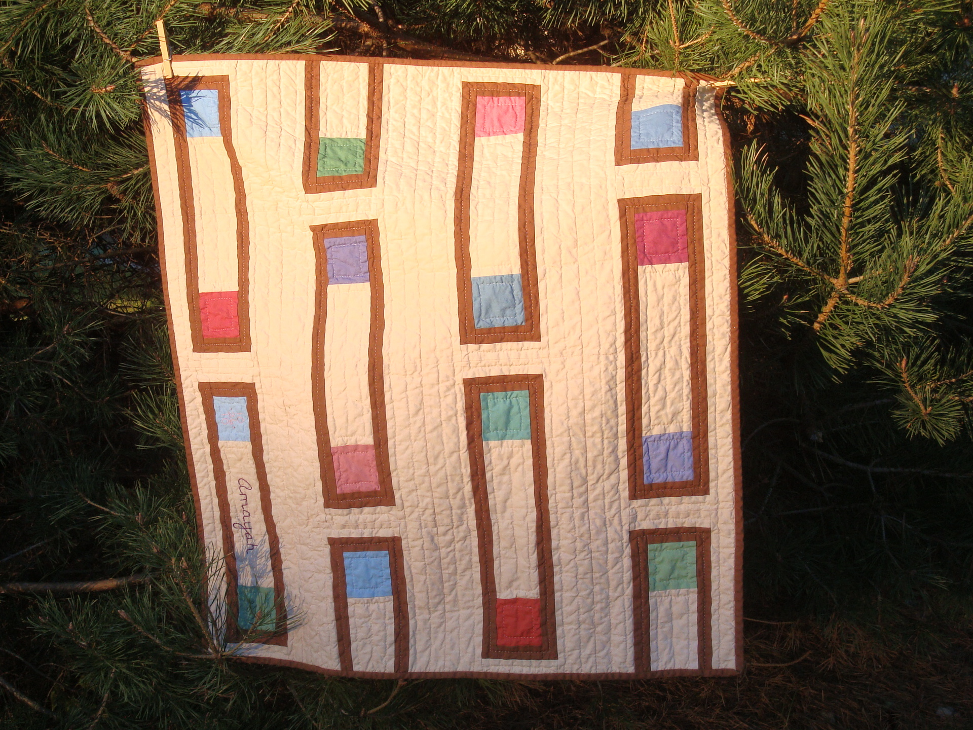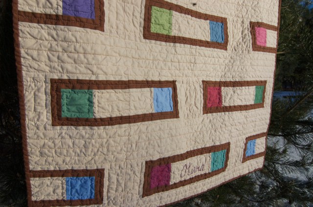 The fall sun can really be harsh for photographing.  The quilts are actually all the same Kona Bone background color with Sable borders and bindings. These color blocks are from Kona’s dusty palette.  The girl colors obviously!