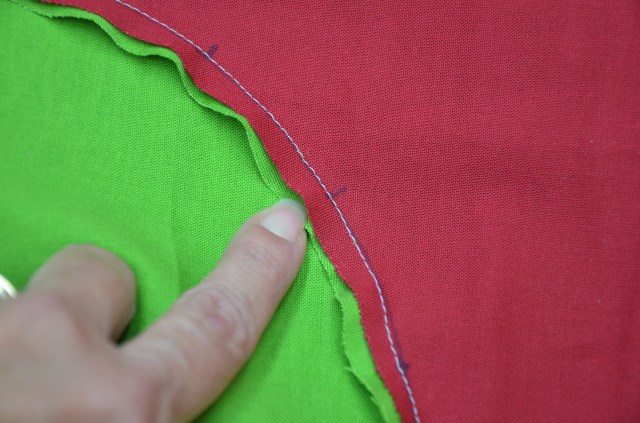 My most anxious piecing was putting the chartreuse, a nearly full circle, into the larger red bubble piece. It wasn’t nearly as scary as I had envisioned it to be. As I cut the pattern apart, I made little clips into each piece to match them back up, after tracing around them and adding the seam allowances.  I also marked the clips with the erasable blue pen so it would be quicker doing my pin ups than searching for a tiny clip.