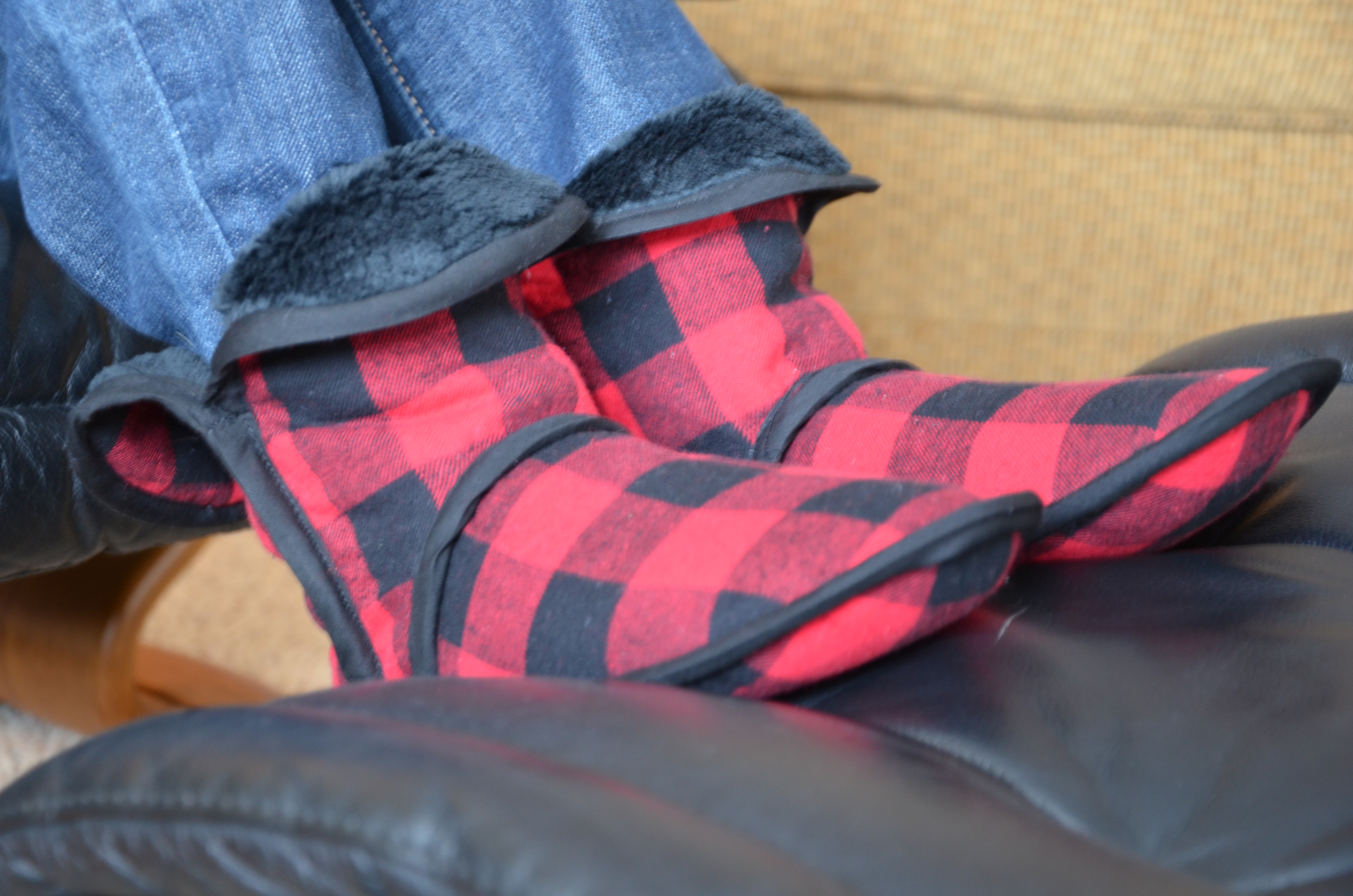 One pair completed. Just look at the way that plaid lines up! For the first pair she used the flannel itself for the bottoms.