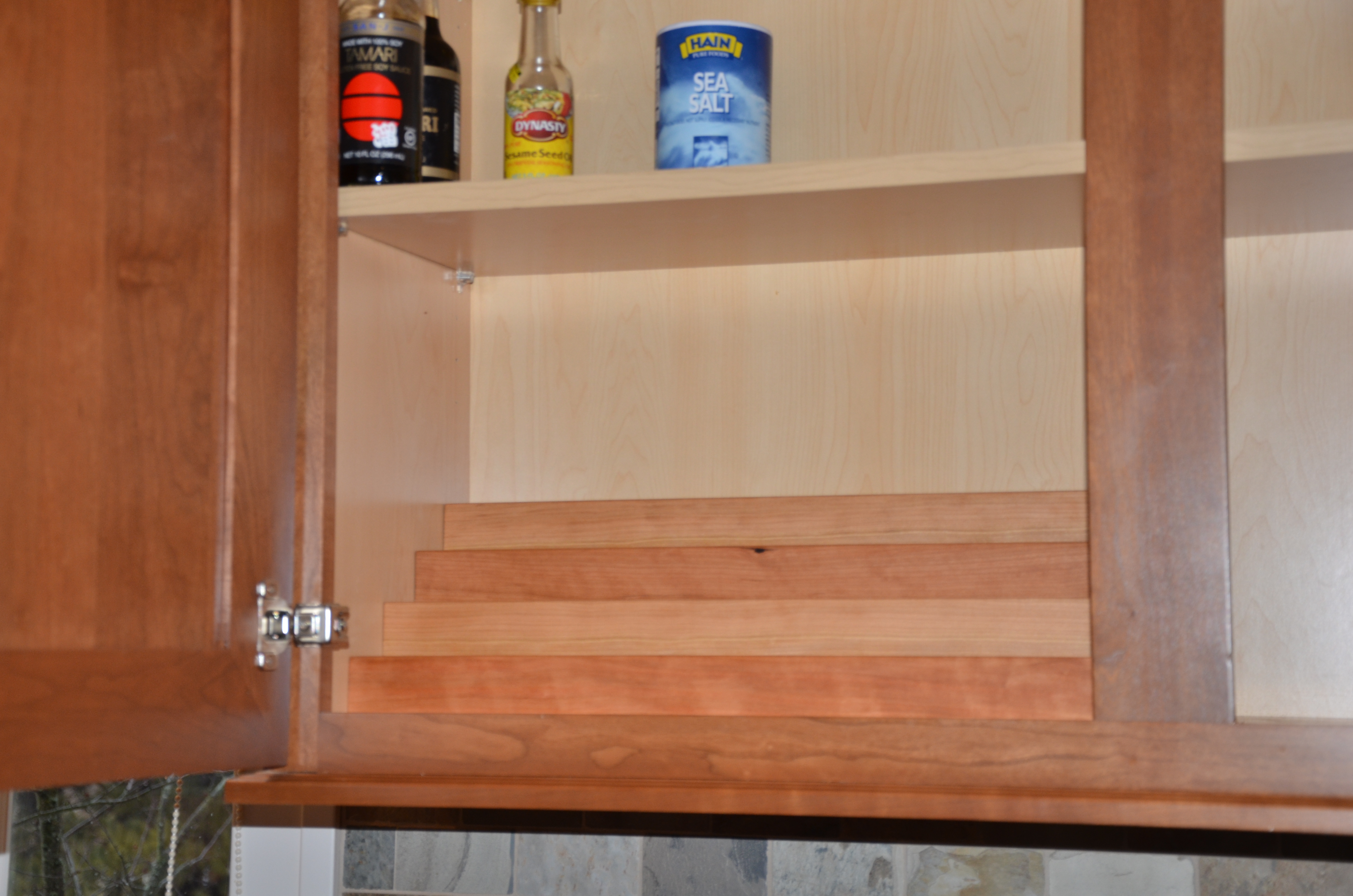 It took me a few weeks before I got Peter fired up to help out. He’s the woodworker I needed to make the risers that were a critical part to the plan. Otherwise I was going to dig out the ole Kindergarten blocks and see if I could make a go of it. Redneck, I know…. Thank goodness I didn’t have to go there. He stepped up and built exactly what I drew, but much neater. He did a beautiful job with scrap cherry. Bonus ~ they match the cabinets!