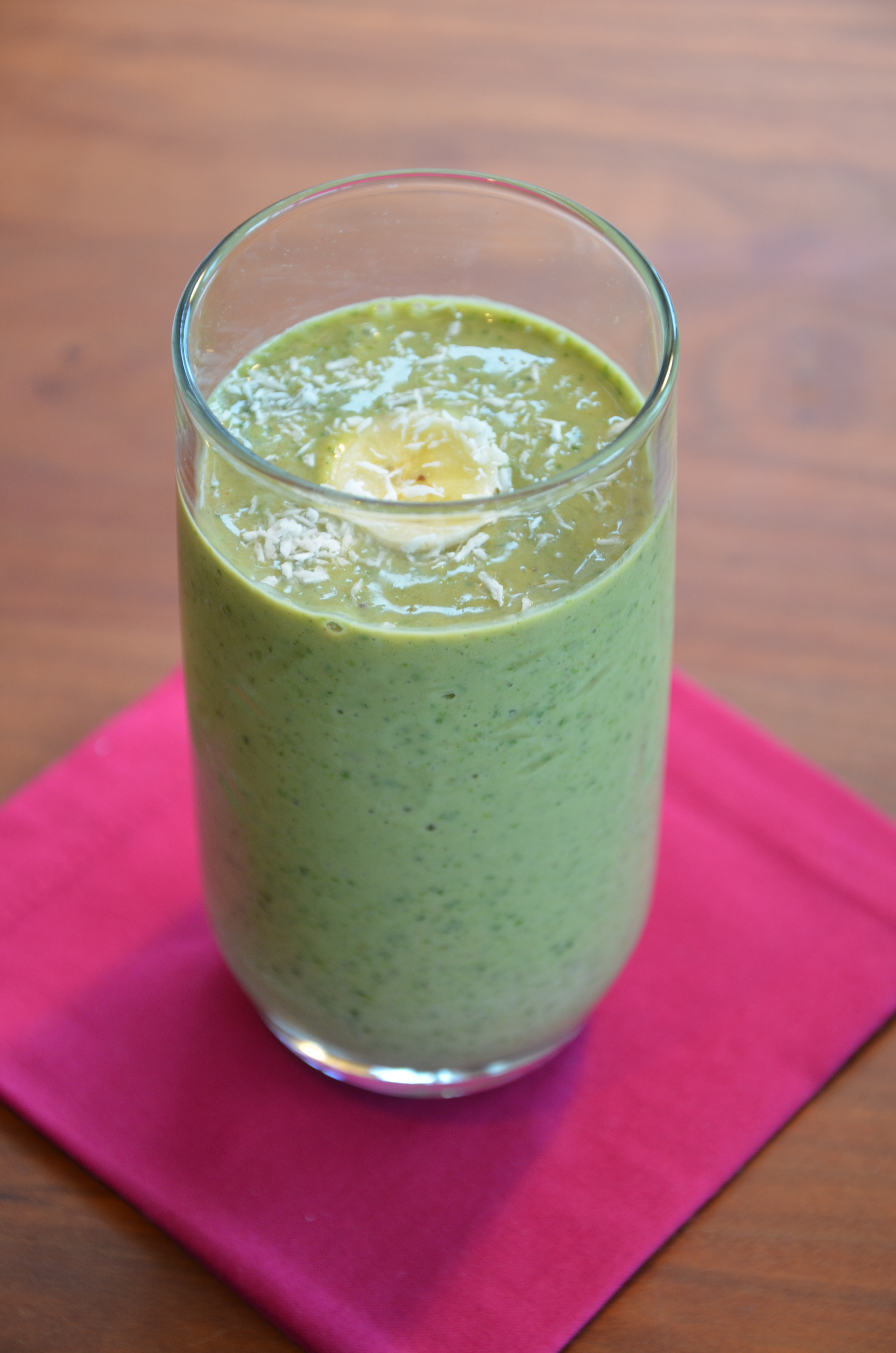Coconut, banana, green smoothie. Yum!With one taste, you’ll be wishing you had doubled the recipe!