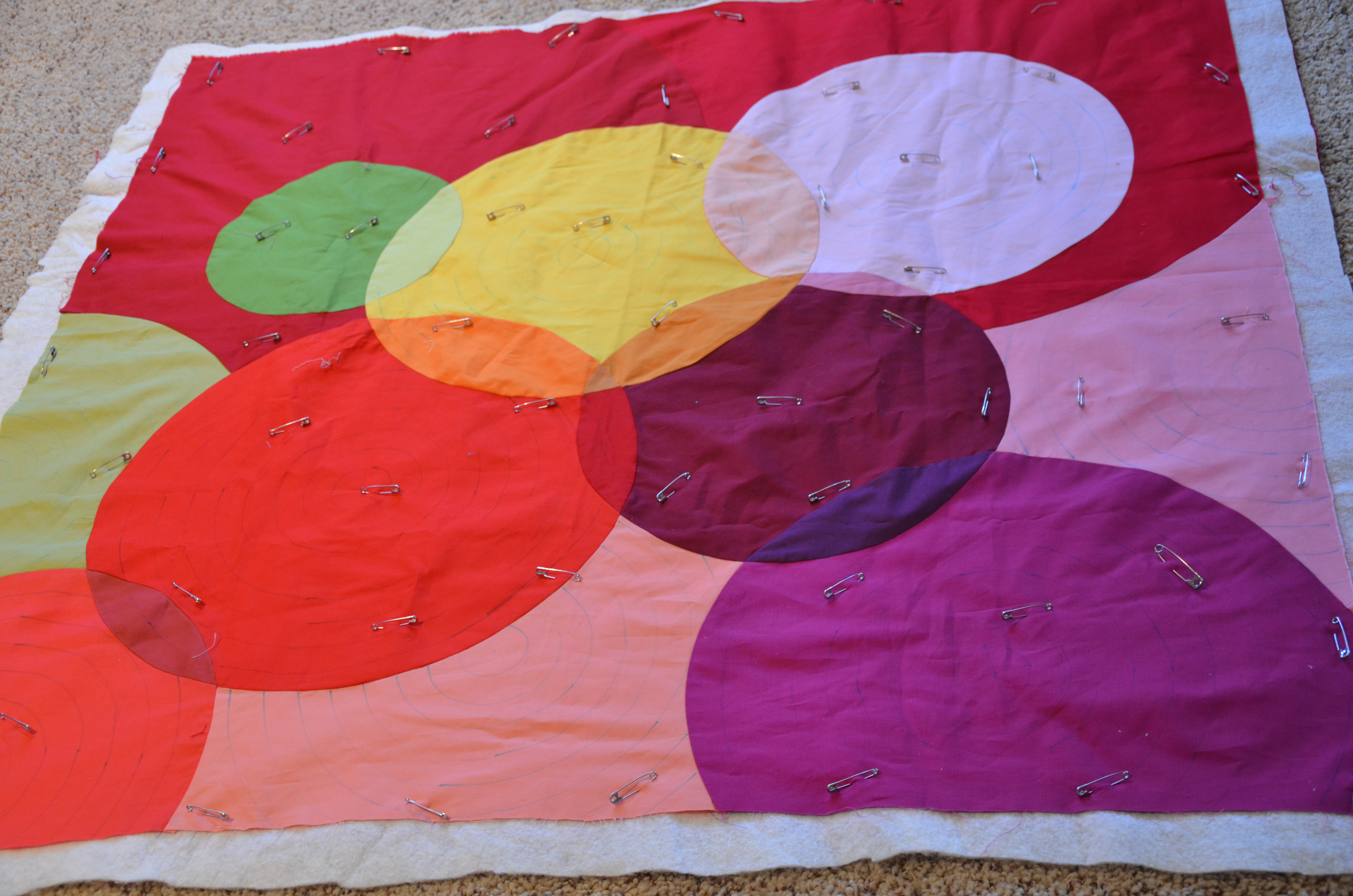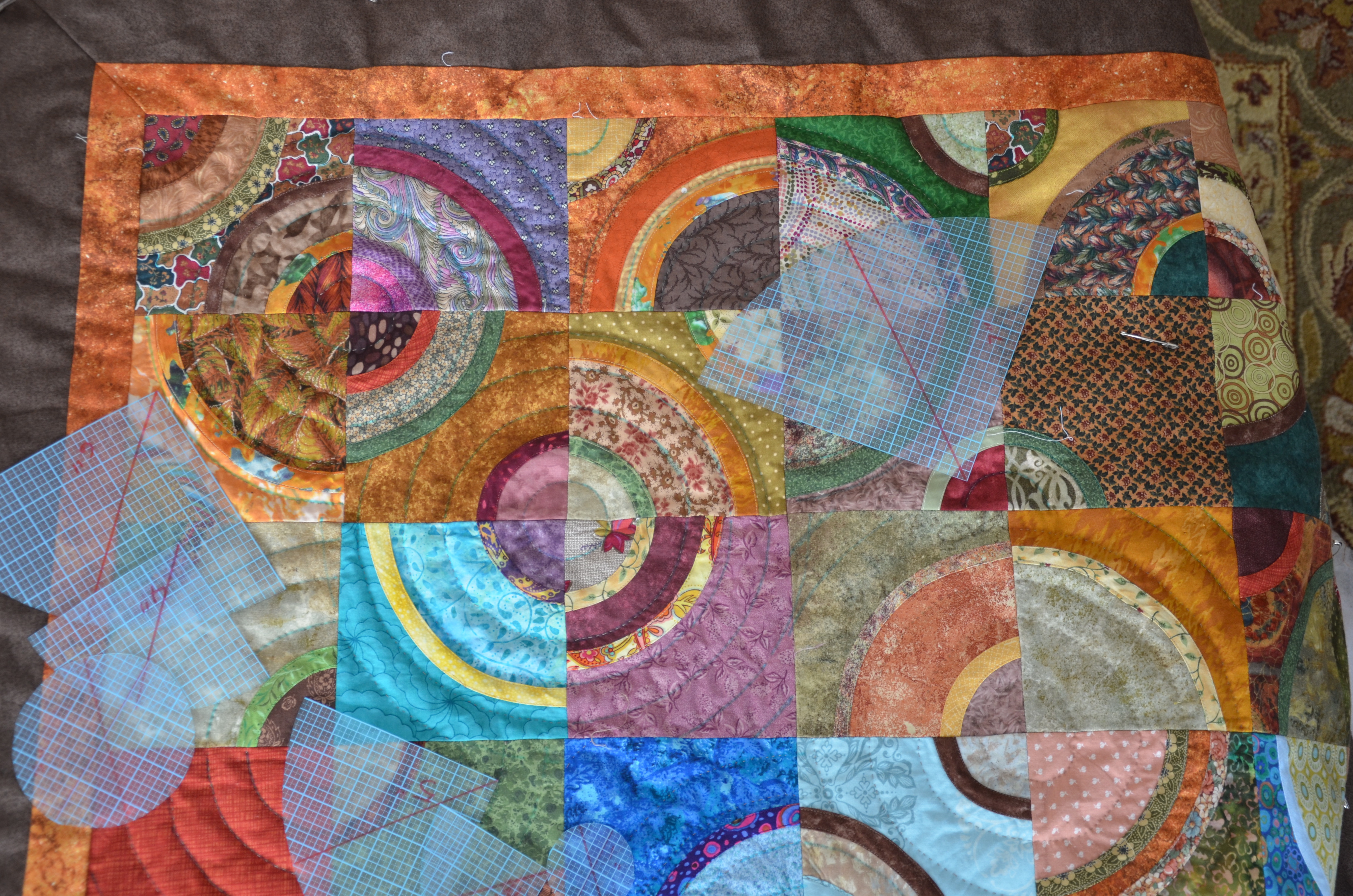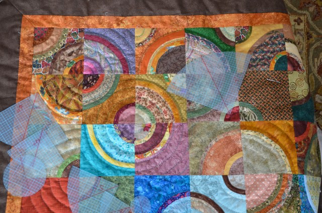 Finally backed and marked, ready to be hand quilted in the same concentric circle pattern as the wall hanging. This one was tricky because of the size of the circles. The templates I’ve made only go up to 16″ diameter. For these I had to use the string attached to a pin with a marker on the other end. It worked. Okay. Not as neat, as I would have liked, hence no picture, but I can correct the waviness with the quilting. Hopefully.