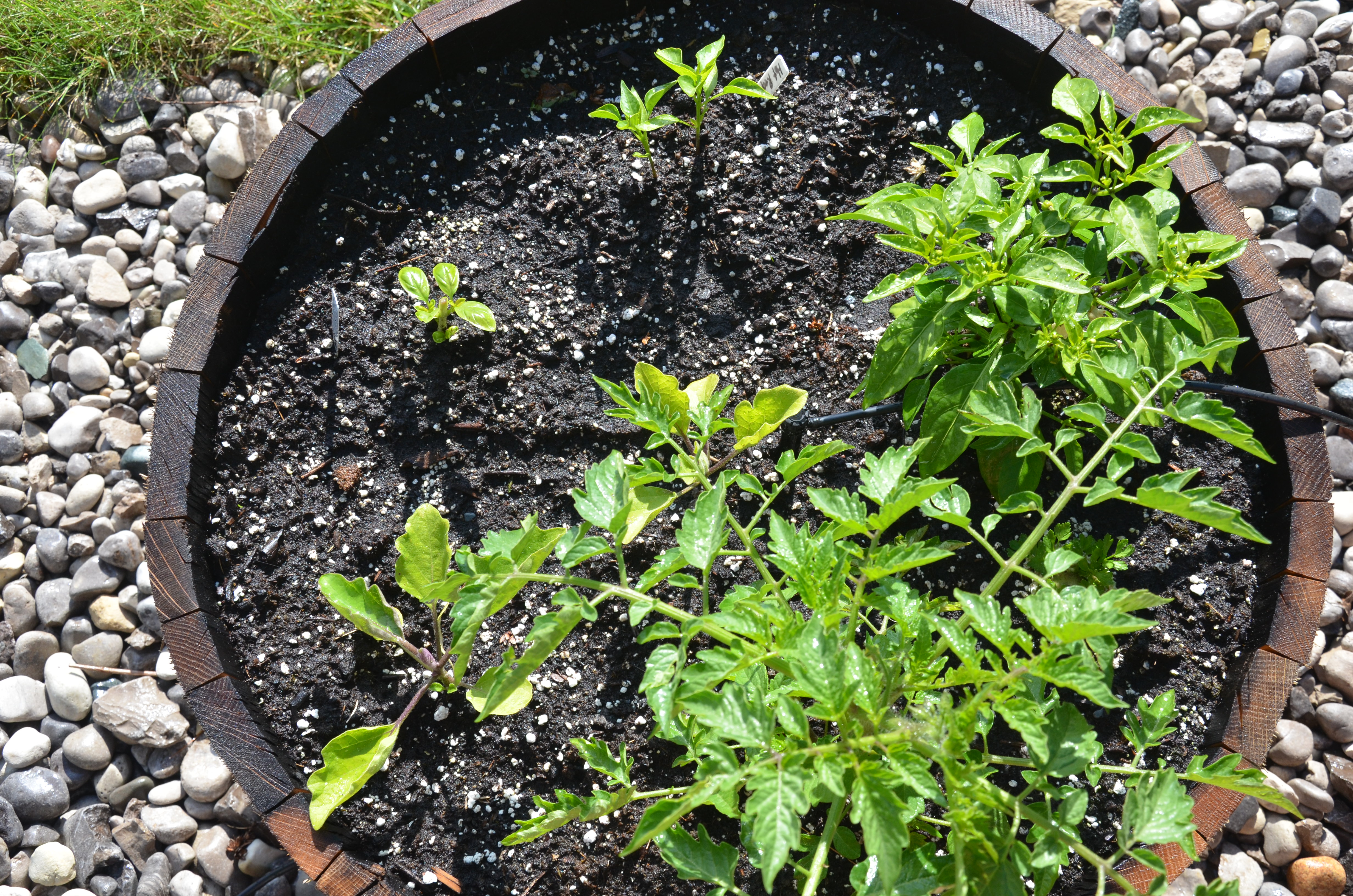 Hot pepper, pepper, tomato, two eggplants, basil ~ Radishes, onions, tomato (yellow?)
