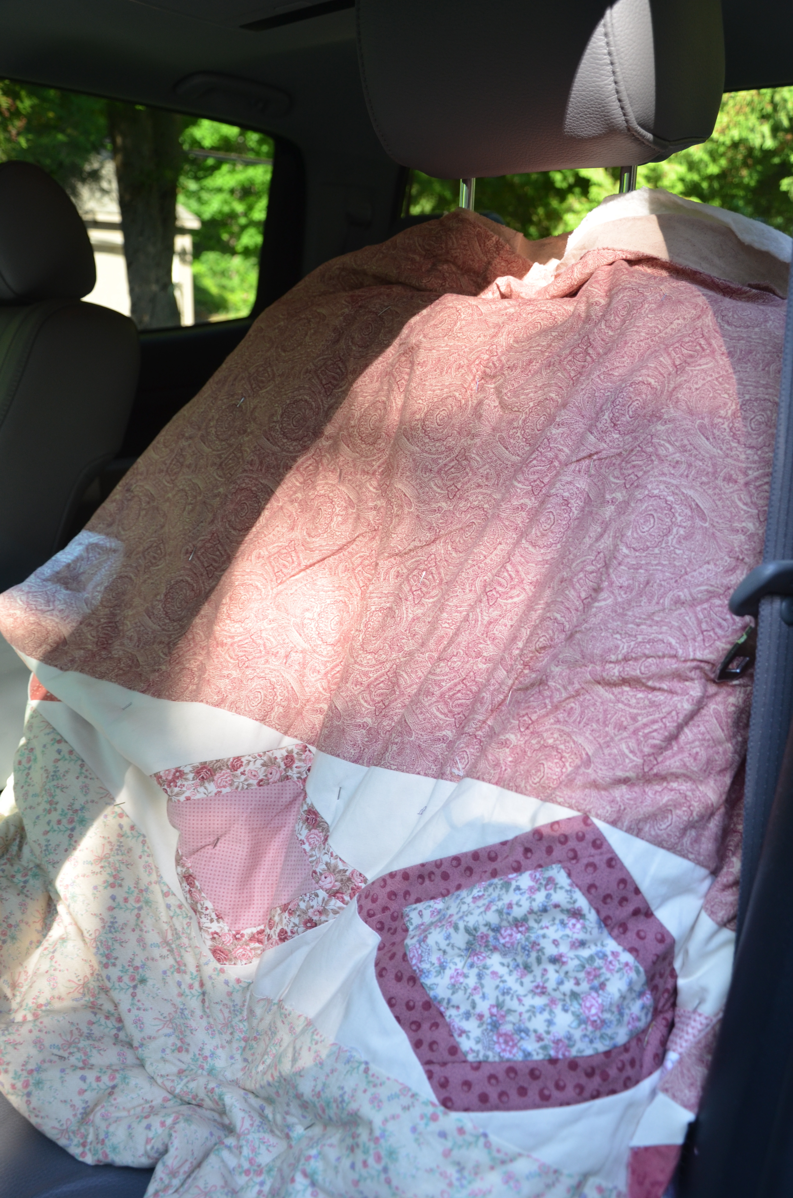 Quite the manly seat cooler, don’t you think. Apparently my husband doesn’t care what it looks like as long as there is something between him and the leather seat. Notice it is pin basted ready to be quilted.