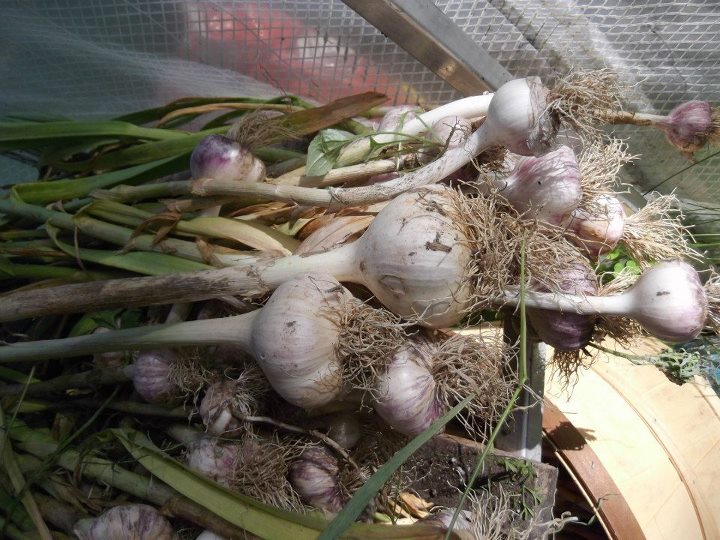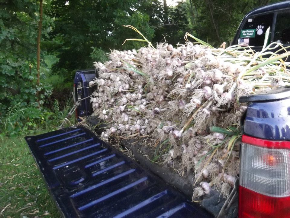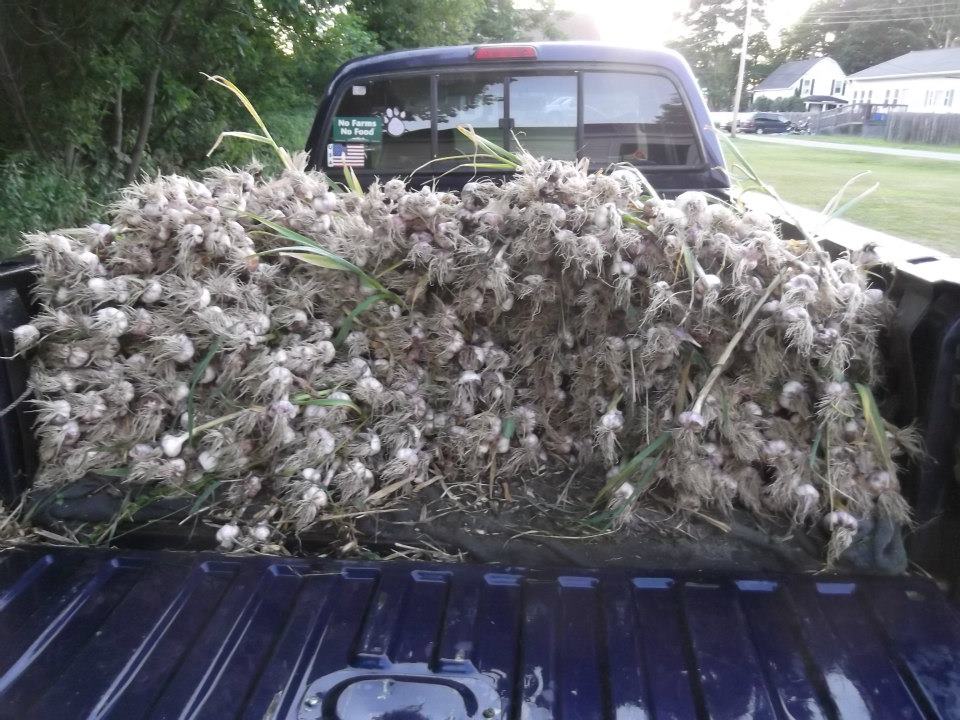 Bob started out much the same way you (sewfrench) did, planting just three cloves that he bought at a farmer’s market. After about 8 years or so he was up to 5,000 garlic plants until one snowless, but bitterly cold, Maine winter he lost nearly all of them when the heads were pushed up out of the ground by frost heaves. He was devastated and almost stopped growing garlic. But his passion for growing won out and he started over, and this year harvested about 6,000 heads of garlic (about 3,500 are his, the rest are his neighbor’s). They expected to plant about 8,000 this year, and they’ll do it all by hand in just one day! They will be ready to harvest next summer.