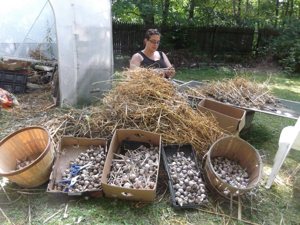 The garlic harvest is a family affair…Bob’s daughter is cutting the top stalks off the garlic itself.