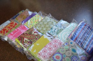 I did get these candy squares cut today. If you aren’t familiar with the term, they are these tiny 2 1/2″ cuts of fabric. 15 packages of 50 different fabric squares cut at 2 1/2″ for an I Want Candy swap. (I know I should have shared this swap sooner, but I wasn’t sure I was going to take part until the very last-minute.)