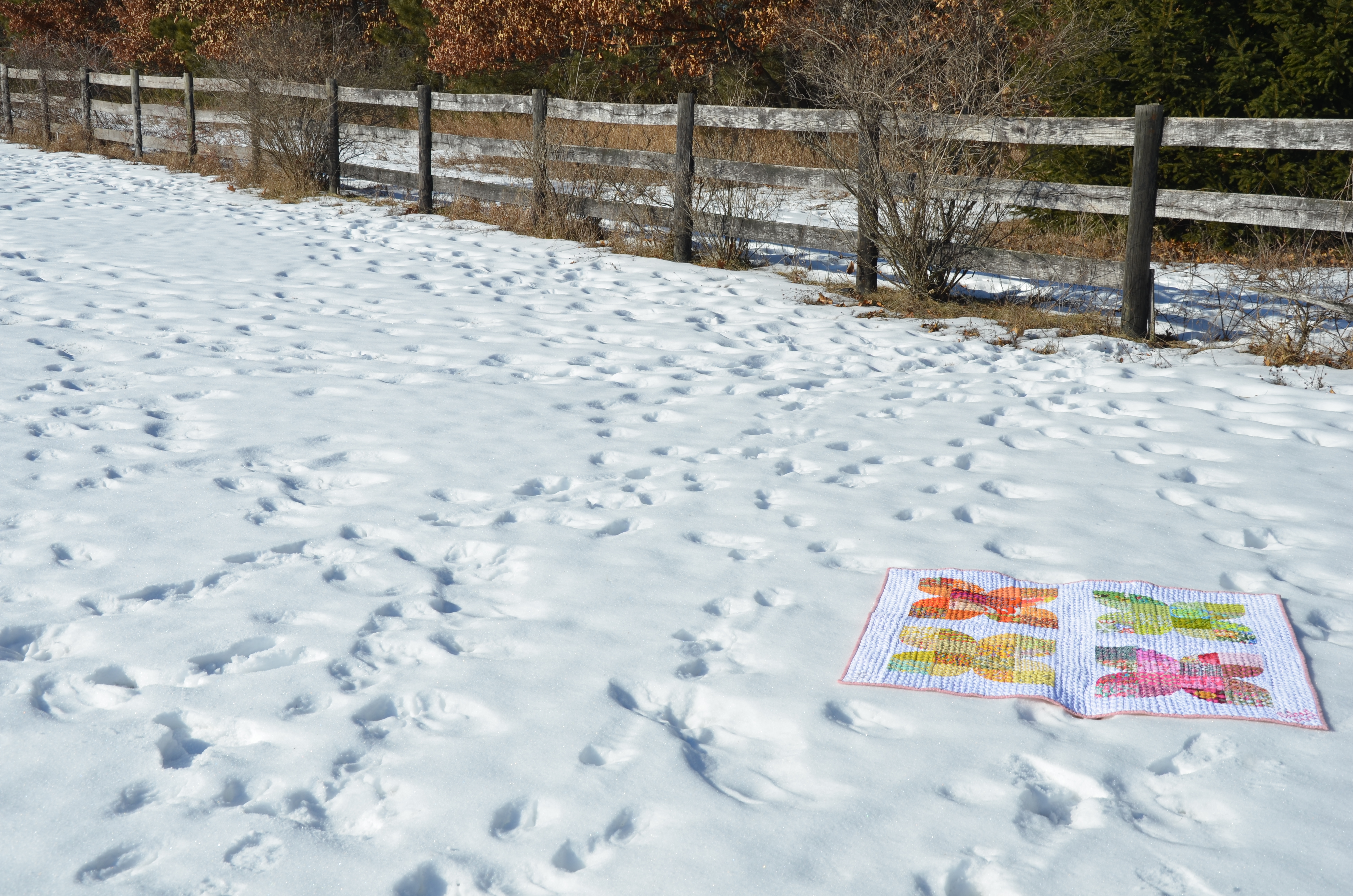 Last week, when I was out photographing my Flower Garden quilt, I was amazed at the amount of tracks there were out back. It hadn’t snowed in a few days, but still WOW. These are not human tracks, this is a very private area. The back of our house is all windows, we would see this kind of party happening if there were people in our backyard.