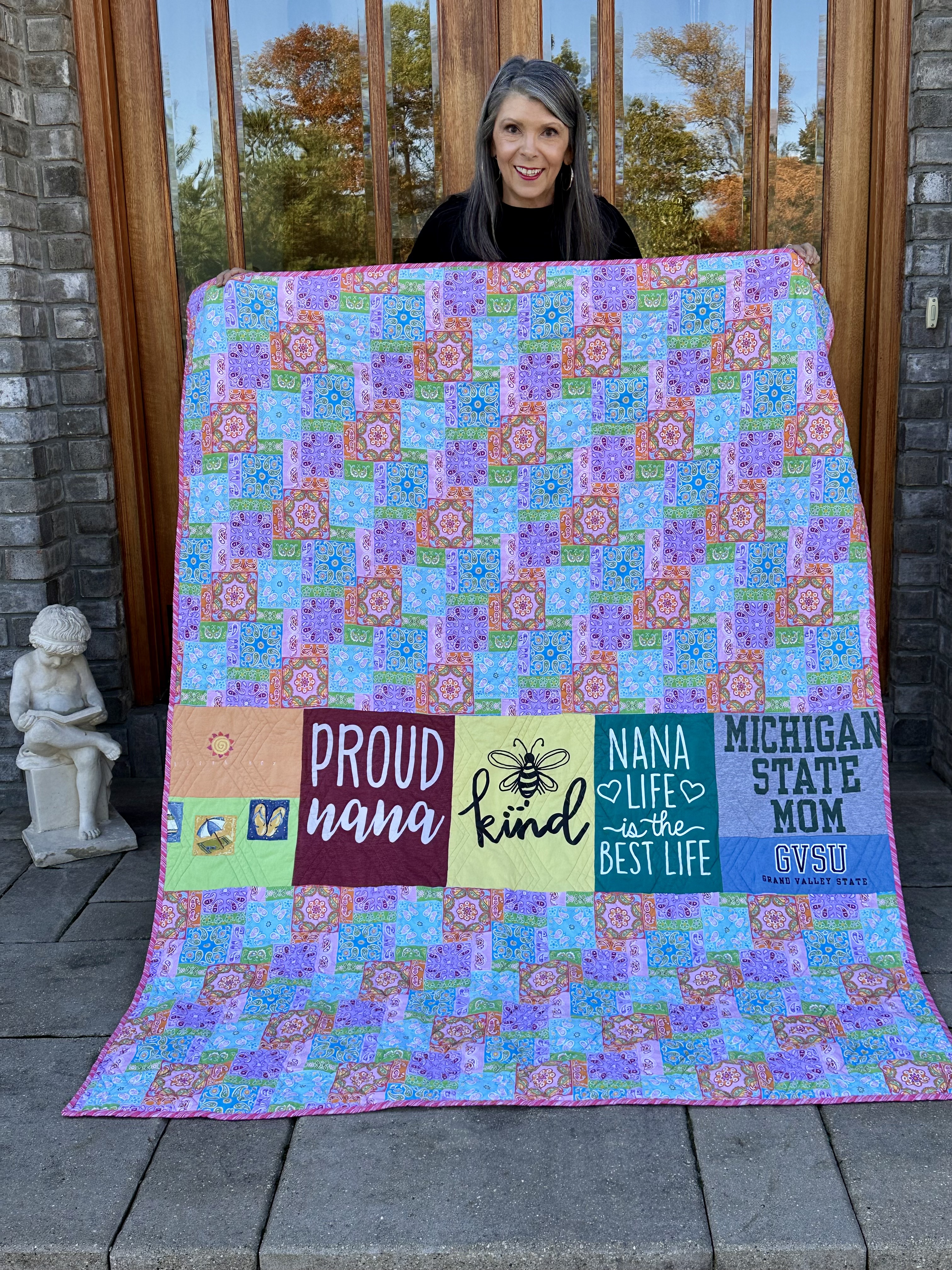 Our oldest daughter’s former college roommate asked me to make a memory quilt from her mother’s tee shirt collection. Of course, I agreed. How could I not, she is like another daughter to us.