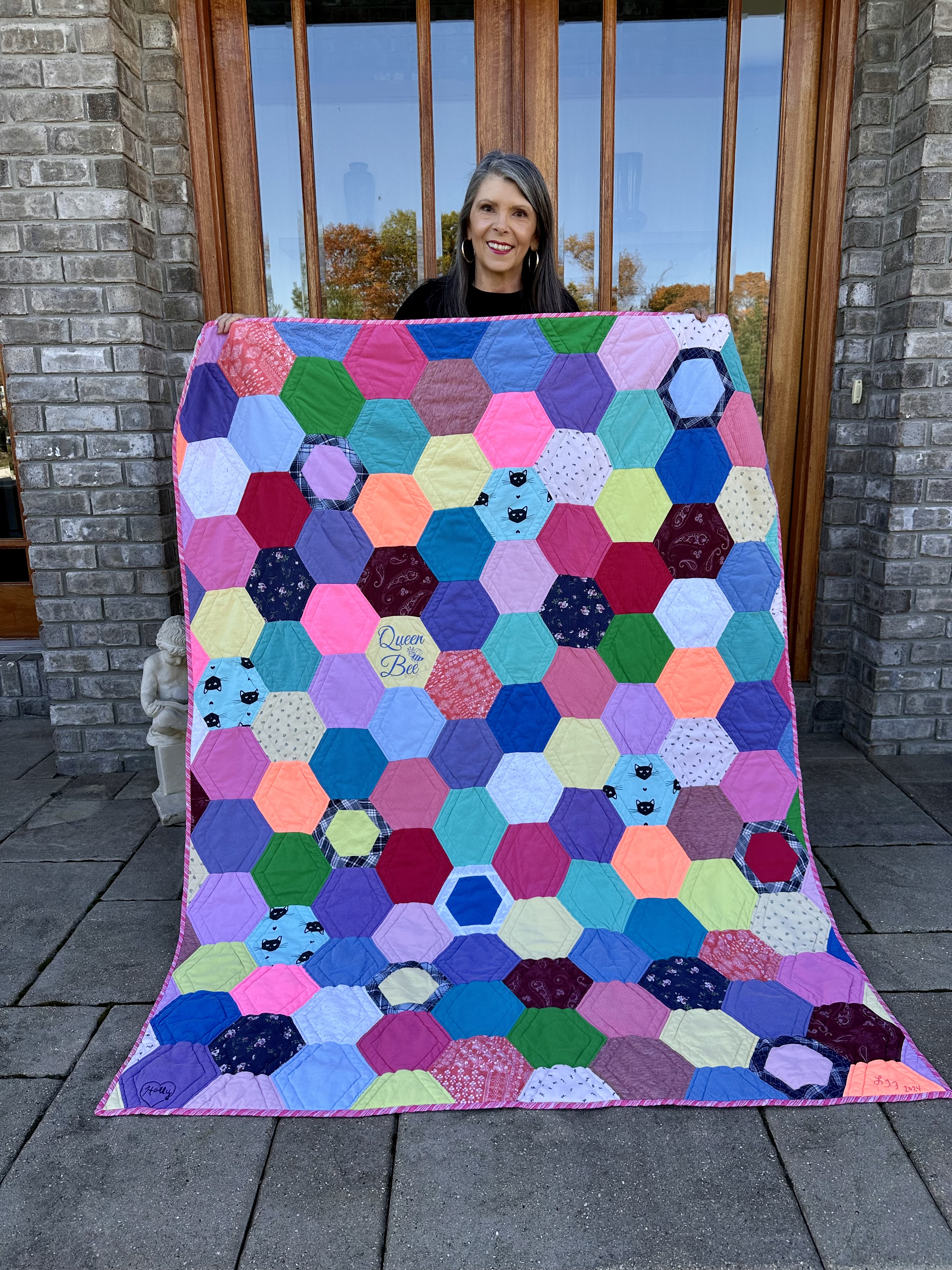 I needed a new idea using smaller blocks for this one. I scrolled through my quilt portfolio and wondered if this jumbo hexagon Honeycomb quilt design would work.