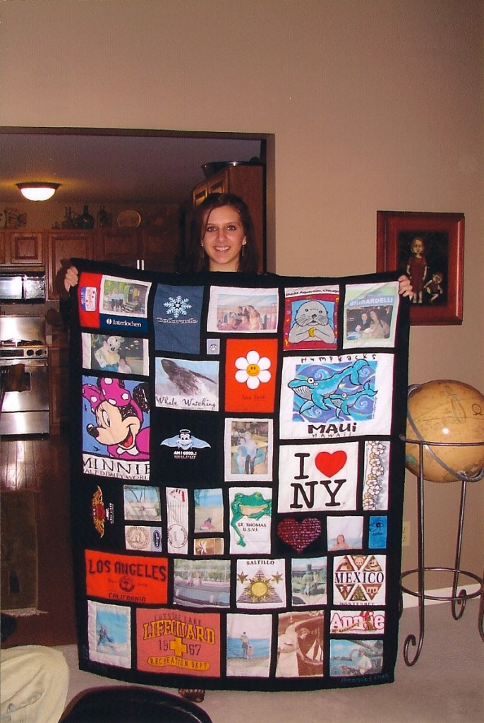This tee-shirt quilt was for Christmas 2005 for our youngest daughter. It was made from her childhood vacation tee shirts. I added in a few photos and framed them all black Kona cotton.