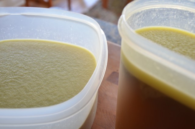I then let this goodness cool, then pour into containers and refrigerate overnight. After it’s chilled the fat rises and will lift off the top.