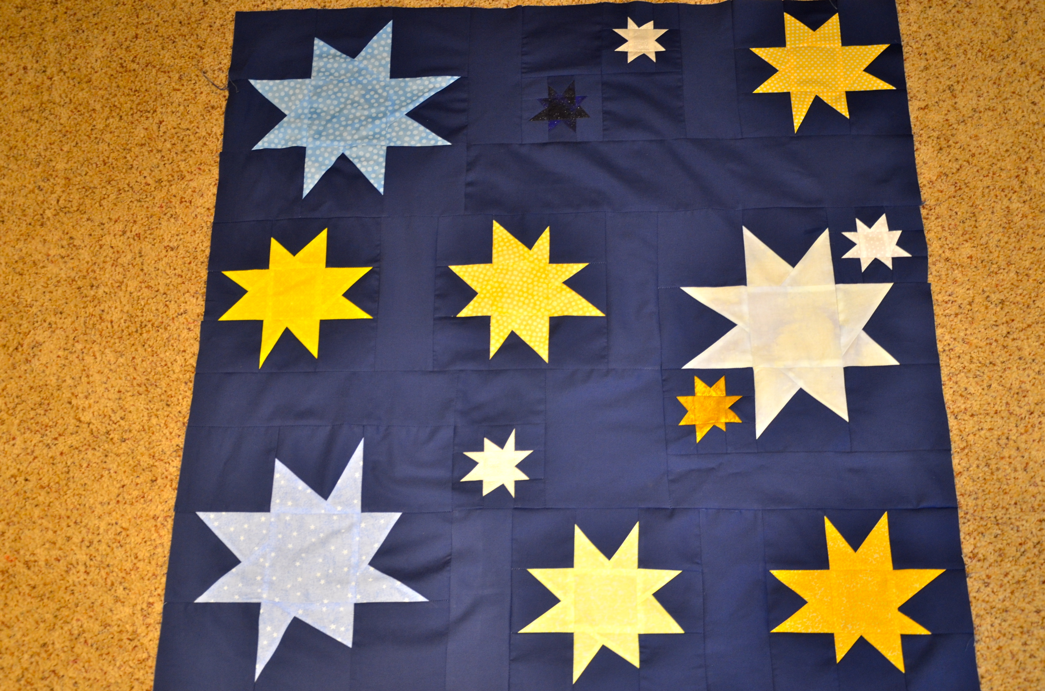 But yesterday, as I was reading all the suggestions and couldn’t get out, I threw together a quilt top that I had been thinking about for quite a while. Everyone else seems to have made a star quilt, except me! Well, I am now the proud owner of a baby sized, Starry, Starry Night finished quilt top! I hacked and whacked and even did a little math. Mostly I just made blocks and then added strips as needed to make them line up square! All from inventory, mostly from scraps, including the navy! It’s about 38″ square. Even have batting and backing for it, how about that?!!