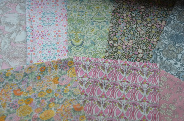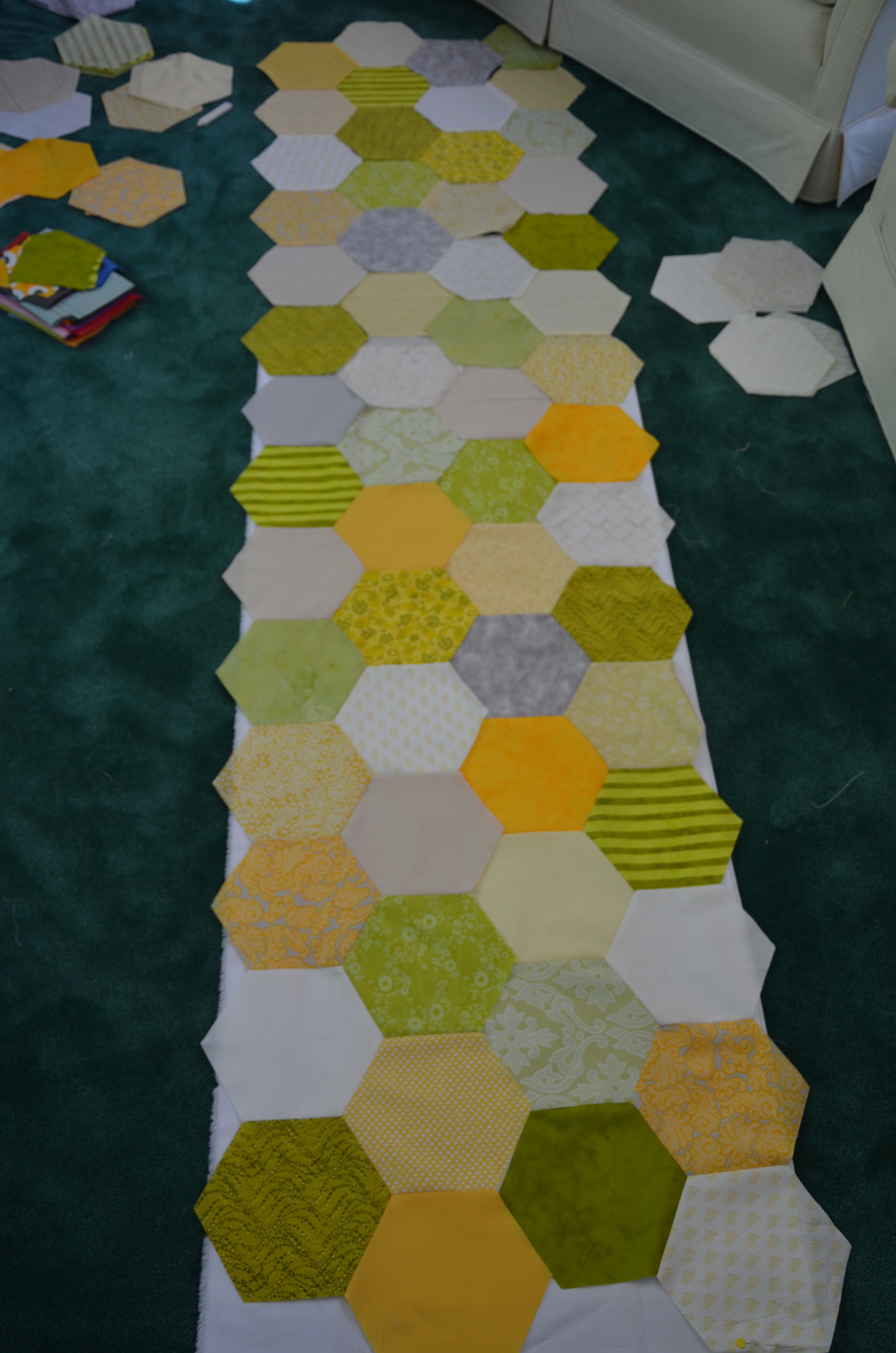Last week’s Honeycomb quilt is coming along nicely. I think I’m one row short of being half way there. I still have to cut the partials for the sides but all the full hexagons are cut and the fabrics are picked up. It feels a lot less cluttered to get the quilt off the floor and on to the wall!