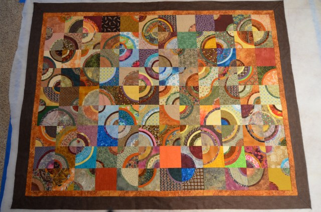 Figured out placement #5. After have 4 place mats finished, keeping my eyes open for appropriate ideas for #5 and #6, this came to me. It’s a variation of one of the earlier ones with a Cherry HouseQuilts twist. I used smaller colorway blocks, finished at 1″, to match the earlier place mat, but other wise the proportions are the same. I love it! Now I need a #6. Maybe one with more of the colors combined? I love Kona cotton solids!